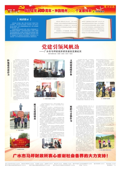 为全面反映我市社会各界办实事、开新局,以昂扬姿态奋力打造“汉襄肱骨、神韵随州”,以优异成绩迎接建党一百周年;为歌颂全市各条战线新业绩,为多视角、多维度展示全市各级各部门高质量发展取得的新成果新成就,随州日报隆重推出“献礼建党100周年•神韵随州100个发展样本之样本财政所”大型专题宣传,今日刊发的是广水市马坪财政所抓党建促发展纪实,敬请读者关注。