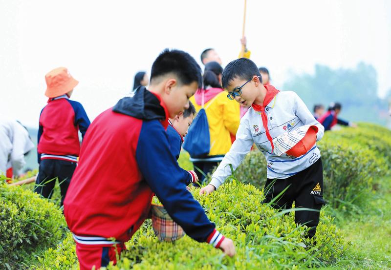 近日,随县小林、草店、万和等地中小学校学生2000余人来到云峰山茶场开展校外研学,采茶、品茶、为茶园锄草,切身感受大自然的魅力。(随州日报全媒记者孙洪涛、通讯员龚承斌、敖秘密摄)