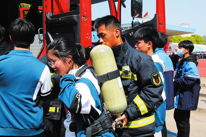 近日,广水市第一高级中学组织开展消防逃生应急疏散演练。消防官兵针对演练情景作出详细点评,现场讲解消防知识。师生们参观了消防器材装备区。图为部分学生佩戴试穿个人防护装备,化身小小“消防员”。 (随州日报特约记者刘冬、通讯员黄萍、王月摄)
