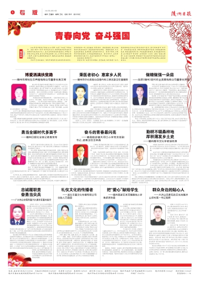 希望全市广大青年牢记嘱托、感恩奋进,始终保持一往无前的精神状态和永不懈怠的奋斗姿态,坚定唱响青年“好声音”、传递青春正能量,争做创新发展的开拓者、协调发展的促进者、绿色发展的践行者、开放发展的推动者、共享发展的参与者,在力推县市“争百强”,培育镇域“小老虎”,绘就“富春山居图”,打造“汉襄肱骨、神韵随州”的生动实践中谱写更加壮美的青春之歌!今日展示的是我市各界优秀青年代表事迹,敬请读者关注。