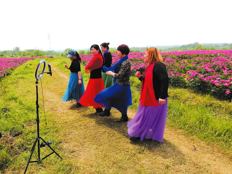 看,拍“抖音”的高手来了!黎笑笑和她的姐妹是第二次来基地游玩,上次来玩时拍的抖音成功吸粉1.4万人。她说,她是芍药基地的免费宣传大使,不少人就是看过她的抖音才知道有这么一个好玩的地方。