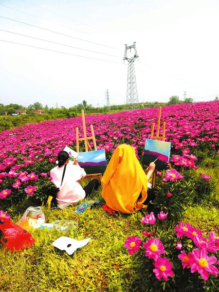 看,写生的小画家来了!花海之中,两名小画家正聚精会神地用画笔描摹着眼前美景,红艳艳的芍药花在蔚蓝的天空下盛开。
