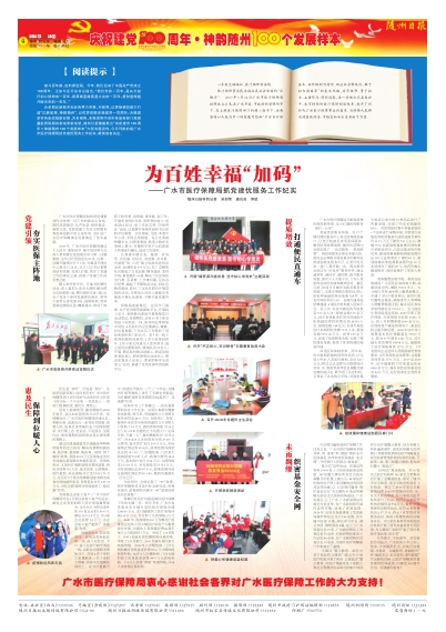为全面反映我市社会各界办实事、开新局,以昂扬姿态奋力打造“汉襄肱骨、神韵随州”,以优异成绩迎接建党一百周年;为歌颂全市各条战线新业绩,为多视角、多维度展示全市各级各部门高质量发展取得的新成果新成就,随州日报隆重推出“庆祝建党100周年•神韵随州100个发展样本”大型专题宣传,今日刊发的是广水市医疗保障局抓党建优服务工作纪实,敬请读者关注。心系民生谋福祉,医疗保障传温情。医疗保障事关民生福祉是社会和谐的“压舱石”。2019年3月14日广水市医疗保障局挂牌成立以来,在广水市委、市政府的坚强领导下,在上级医疗保障部门的精心指导下,该局坚持以人民为中心的发展思想和“千方百计保基本、始终做到可持续、回应社会解民忧、敢于担当推改革”的基本思路,肩负使命、勇于担当、主动作为、创新进取,进一步健全完善更公平、更可持续的医疗保障制度体系,掀开了新时代广水医疗保障事业新篇章,为增强人民群众健康获得感、幸福感和安全感贡献了力量。