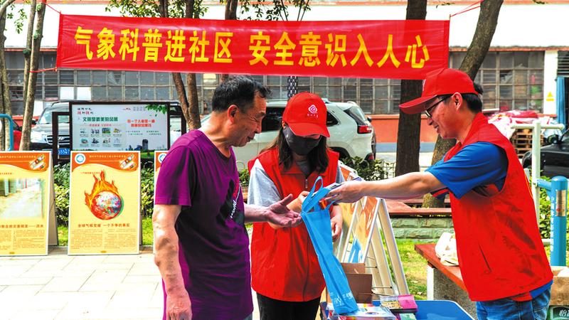 近日,随州市气象局积极开展气象科普宣传进社区活动,志愿者们走进曾都区东城办事处龙门街社区,为居民发放气象科普宣传资料,讲解气象防灾减灾知识。(随州日报通讯员车俊志摄)