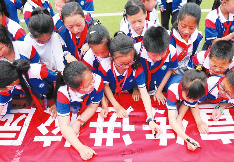 “六一”儿童节到来之际,随州车站派出所组织团员青年走进随州市季梁学校,采取讲解铁路安全知识、发放宣传单、千人签名等多种形式,开展以“争当爱护铁路小卫士”为主题的爱路护路宣传日活动,营造良好的铁路运输和治安环境。(随州日报全媒记者李文军、通讯员蒋辉摄)