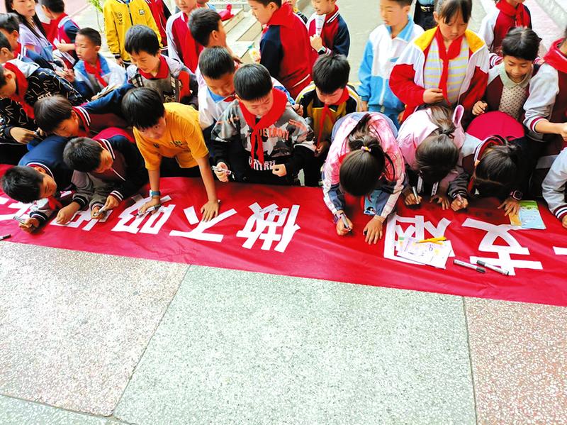 近日,随县疾控中心联合万和镇中心卫生院深入万和镇小学,通过发放宣传资料、互动问答、讲后问卷等形式开展健康素养巡讲活动。图为学生们在“拒吸第一支烟,做不吸烟新一代”横幅上签下自己的名字。(随州日报通讯员刘小康摄)
