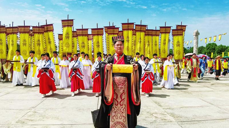 6月24日,炎帝故里景区“寻根故里·燃情一夏”大端午节特色专场系列活动中举行的拜祖仪式,再现寻根节拜祖大典的盛况。