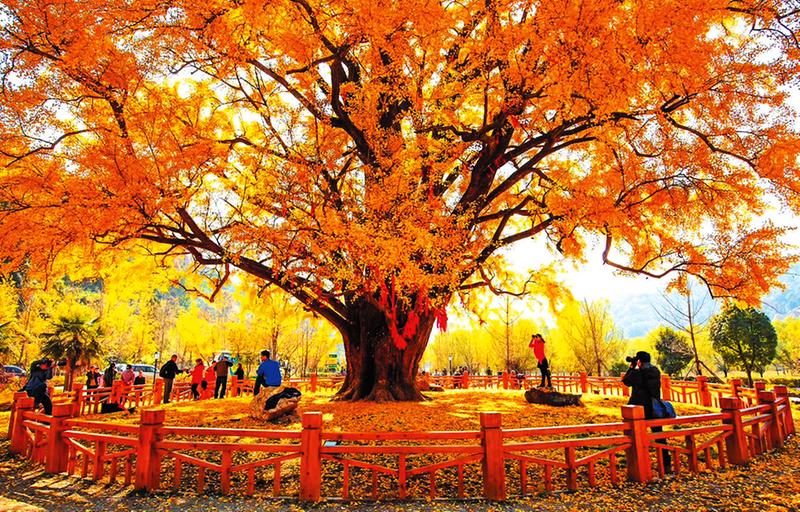 千年帝王杏(游览时间约30分钟):此树为光武帝刘秀与皇后阴丽华亲手所植,祈求天下苍生早日脱离战乱之苦,安居乐业。树高38米,直径2.61米,树冠荫笼面积400多平方米,树围8.2米,七八个人才可环抱树腰,此树根深须广,枝繁叶茂。春夏时节,叶片翠绿,绿荫葱笼;金秋时节,叶片金黄,鲜艳夺目,与四周层林尽染的远山近峦相互辉映,似一尊顶天立地的金身大佛,耸立在色彩斑斓的世界里,极为壮观。