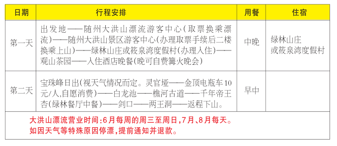 出发地——随州大洪山漂流游客中心(取票换乘漂流)——随州大洪山景区游客中心(办理取票手续后二楼换乘上山)——绿林山庄或筱泉湾度假村(办理入住)——观山茶园——入住酒店晚餐(晚可自费篝火晚会)宝珠峰日出(视天气情况而定。灵官垭——金顶电瓶车10元/人,自愿消费)——白龙池——樵河古道——千年帝王杏(绿林餐厅中餐)——剑口——两王洞——返程下山。第二天住宿日期早中行程安排用餐第一天绿林山庄或筱泉湾度假村中晚大洪山漂流营业时间:6月每周的周三至周日,7月、8月每天。如因天气等特殊原因停漂,提前通知并退款。