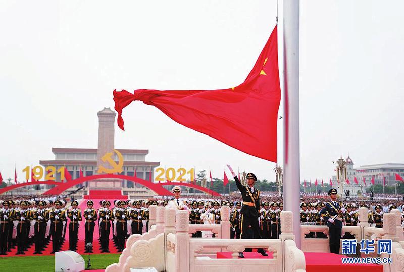 7月1 日上午,庆祝中国共产党成立100周年大会在北京天安门广场隆重举行。图为升国旗仪式。(新华社发)