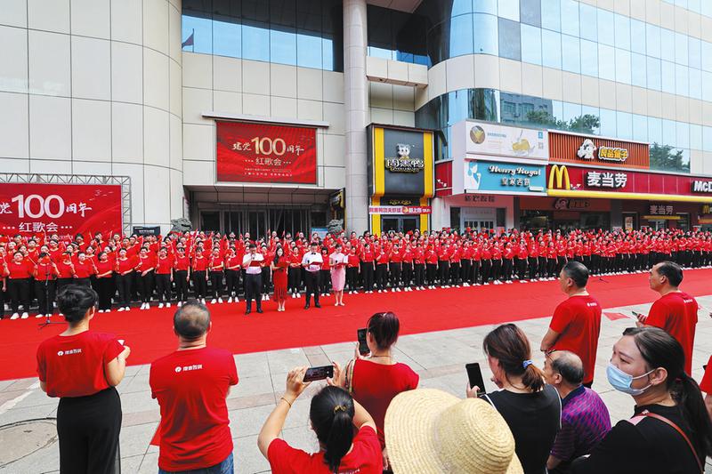 7月1日,银泰随州新世纪购物中心举行建党100周年红歌会,300余名党员和职工一起高声歌唱党、歌唱祖国,共同庆祝党的百年华诞。 (随州日报全媒记者李文军摄)