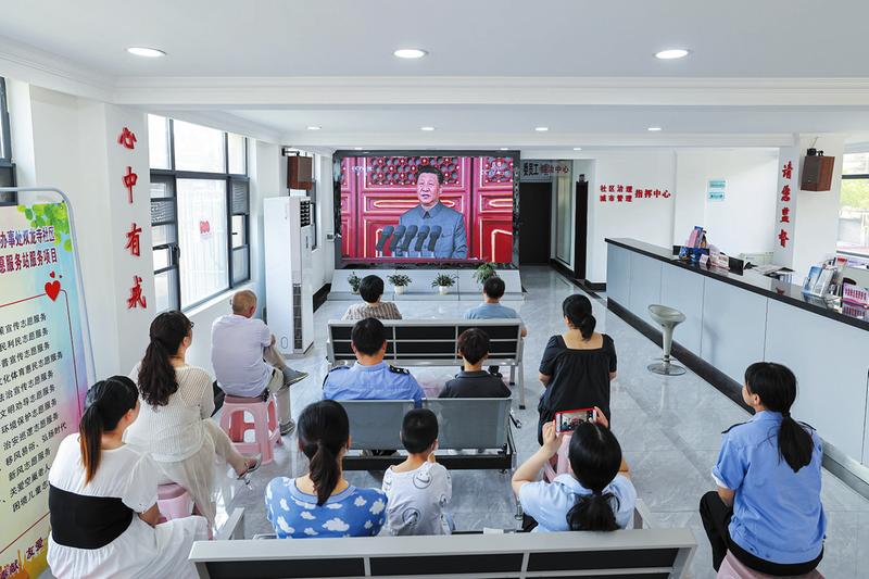 7月1日,曾都区西城办事处双龙寺社区组织全体党员干部集中收看中国共产党成立100周年大会。 (随州日报全媒记者李文军摄)