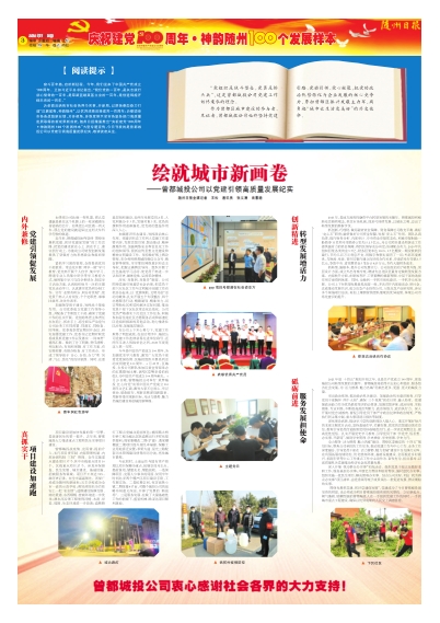 为全面反映我市社会各界办实事、开新局,以昂扬姿态奋力打造“汉襄肱骨、神韵随州”,以优异成绩迎接建党一百周年;为歌颂全市各条战线新业绩,为多视角、多维度展示全市各级各部门高质量发展取得的新成果新成就,随州日报隆重推出“庆祝建党100周年•神韵随州100个发展样本”大型专题宣传,今日刊发的是曾都城投公司以党建引领高质量发展纪实,敬请读者关注。