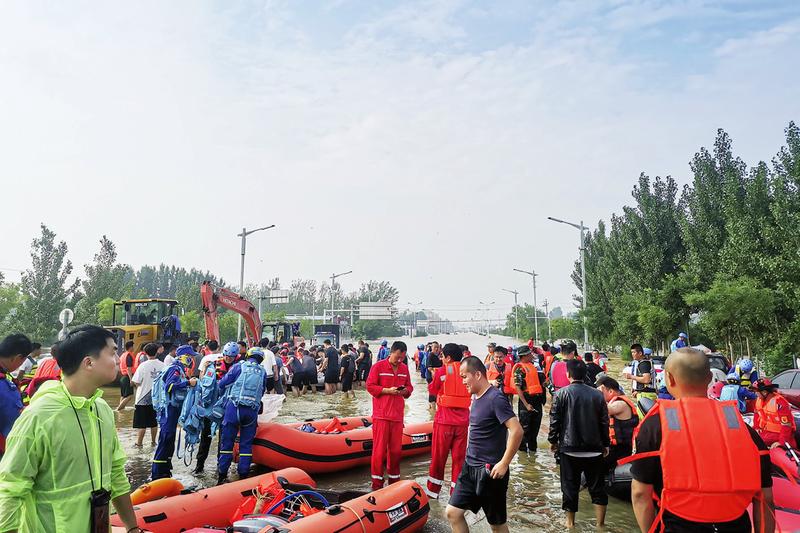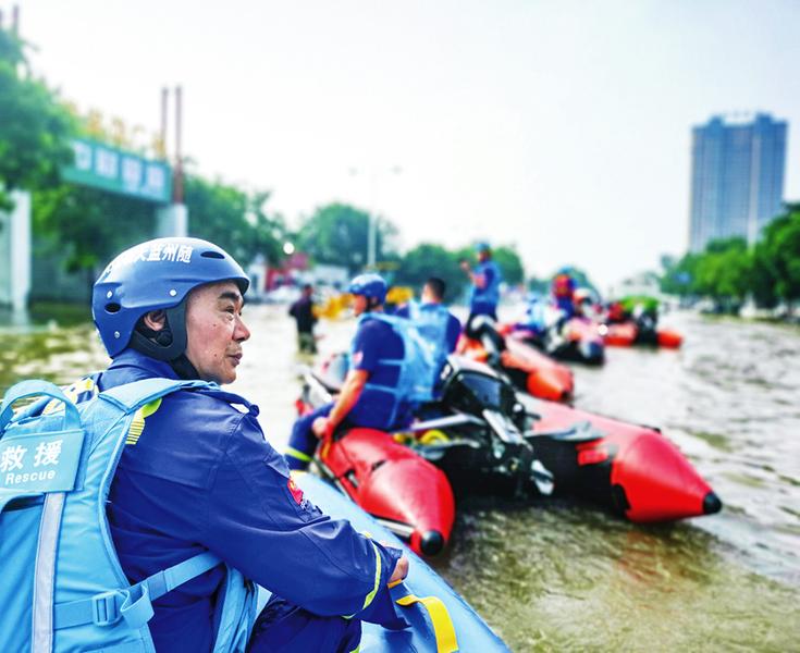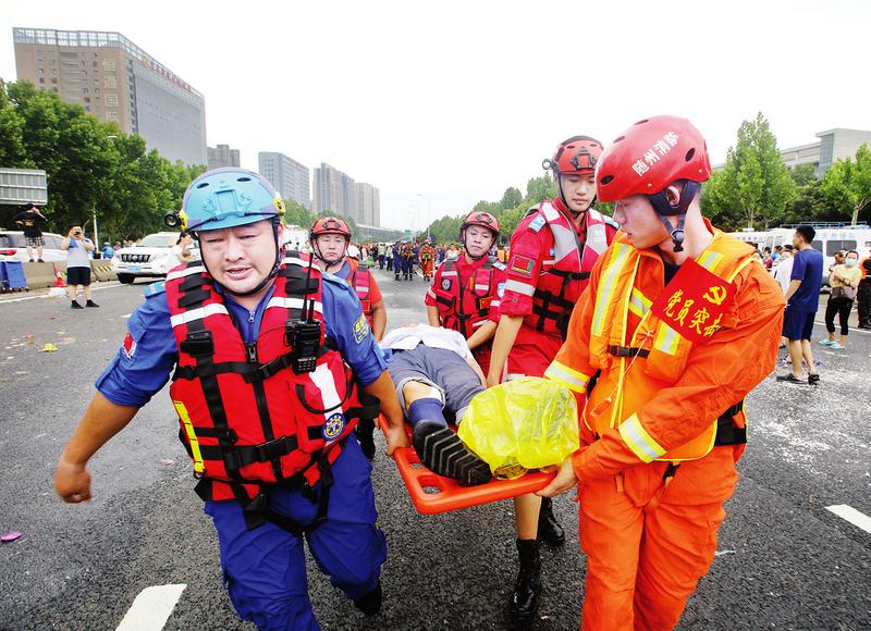 随州消防51名指战员驰援郑州抢险救援。图为7月22日,随州消防队员在郑州转移被困群众。(随州日报全媒记者李文军、徐斌摄)
