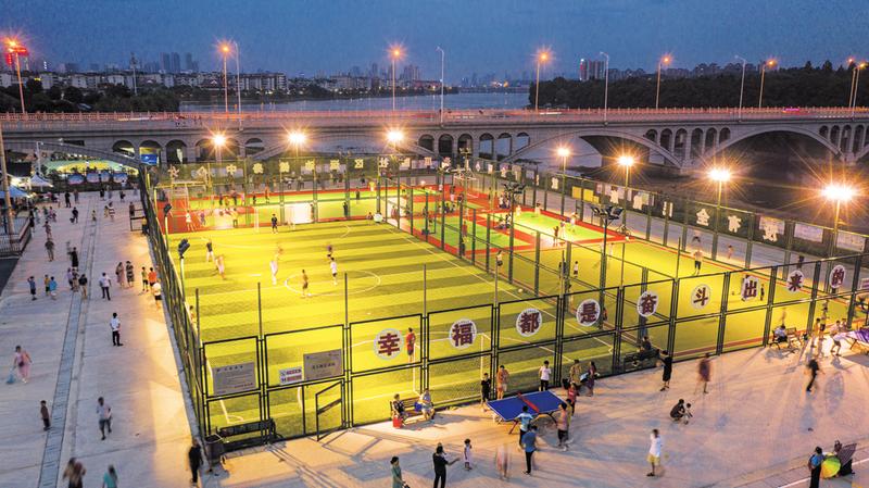 瓜园社区居民好福气,家门口有了体育运动场。曾都区南郊街道瓜园社区在涢水河畔兴建的体育运动场,如今成了居民健身和运动的新乐园。每天晚上运动场爆满,前来跳广场舞、踢足球、打篮球、乒乓球、羽毛球的小区居民在这里享受着家门口运动带来的快乐。(随州日报全媒记者李文军摄)