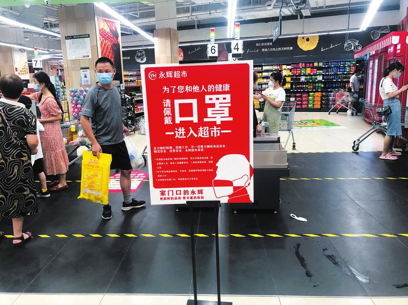 我市各商超进一步加强疫情防控举措。图为万达永辉超市要求顾客们必须佩戴好口罩,在门口扫健康码并接受体温检测后进入卖场。(随州日报全媒记者王聪莹摄)