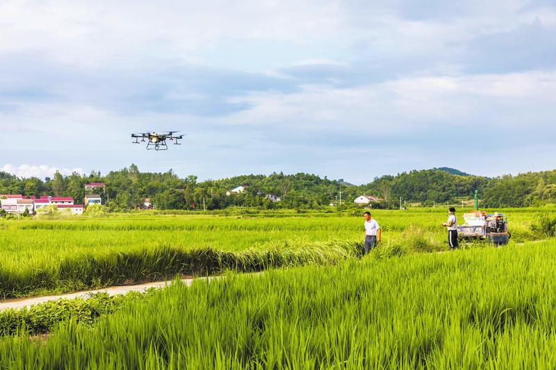 8月17日,曾都区何店镇一种粮大户正操作植保无人机对水稻进行“飞防”作业,防治灾后病虫害。 (随州日报全媒记者李文军、通讯员韩起璞摄)