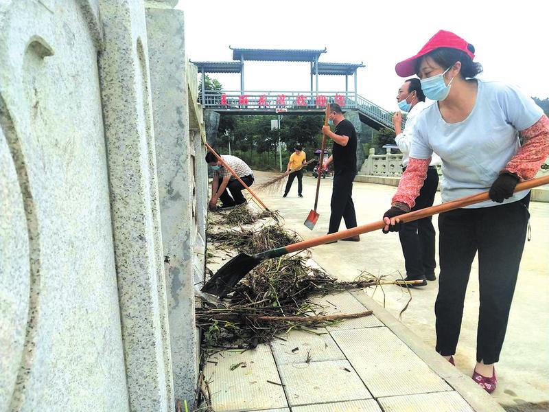 曾都区审计局积极投身驻点村灾后重建工作,组成志愿服务队协助清理淤积路面1500米,清运垃圾3.8吨,看望慰问受灾群众24户。图为该局志愿者在何店镇花塆村清理路面垃圾。 (随州日报通讯员 朱忠保 石倩夕摄)