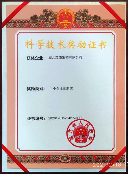 截至目前,公司通过各种类型的招聘平台共选拔优秀大学生80多人,有的已成长为公司发展的骨干精英。公司现拥有享受国务院特殊津贴专家、全国五一劳动奖章获得者、湖北省有突出贡献中青年专家、高级工程师、高级经济师、注册会计师等各类高端人才。2020年,茂盛生物荣获为湖北省中小企业创新奖。