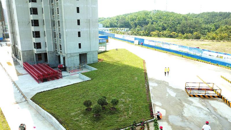 工地四周采用统一风格的仿真草坪围挡,入场道路全部硬化,扬尘噪音指标实时监测,达临界值系统自动发出报警,提醒监管部门和施工单位采取措施。布设在工地围挡、建筑主体脚手架上的喷淋装置定时开启降尘。这是在随州城市公共活动中心综合体项目现场看到的一幕。