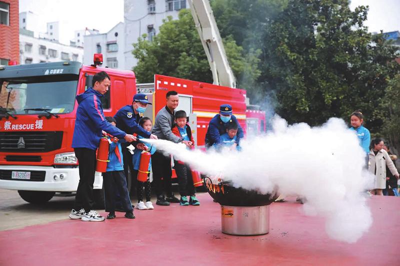 11月3日,市消防救援支队开展消防宣传进校园活动。图为在随州盈瑞实验学校,消防员在手把手地教学生使用灭火器扑火。 (随州日报通讯员程奇摄)