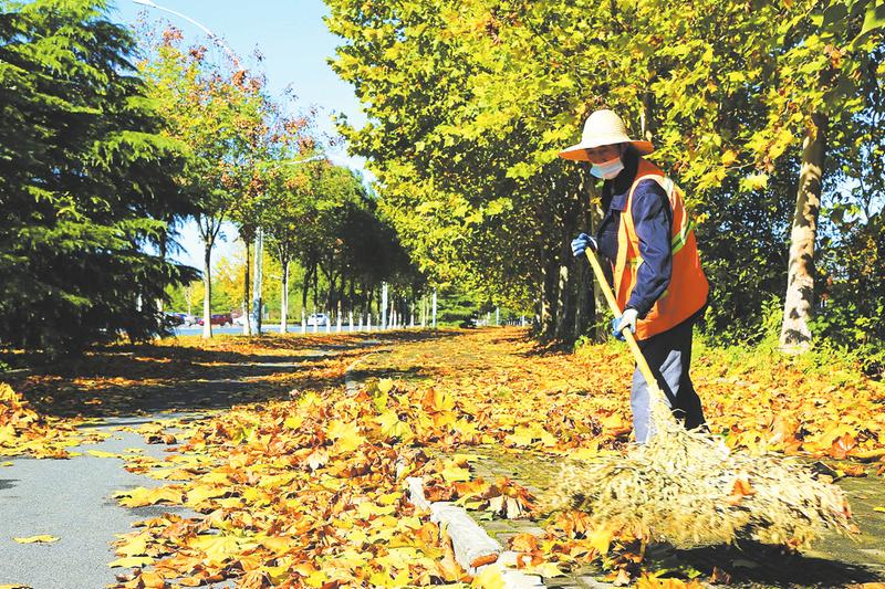 最近昼夜温差大,随州城区树木落叶剧增,环卫工人增加清扫频次,每天清理落叶近200吨。(随州日报通讯员聂少锋摄)