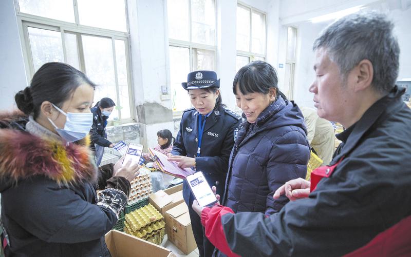 为进一步防范新型诈骗违法犯罪,切实提高辖区群众的自我防范意识,曾都区公安局北郊派出所民警走进社区和工厂,开展防诈骗知识宣传。图为12月15日,该所民警在亚通社区随州市玉斌食品有限公司指导工人下载安装反诈骗APP。 (随州日报全媒记者 李文军摄)