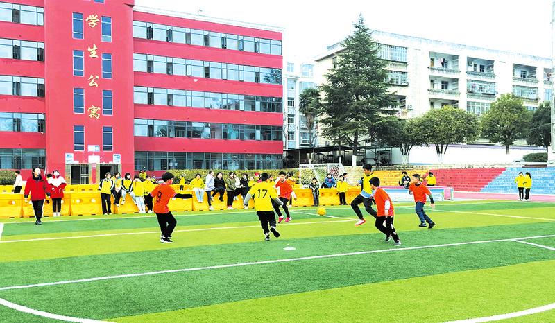 曾都区洛阳镇高级小学致力于发展足球特色学校,在第六届曾都区中小学生足球联赛中,荣获小学组男子冠军、女子亚军。图为近日该校举行校园足球联赛。(随州日报通讯员 申明国摄)