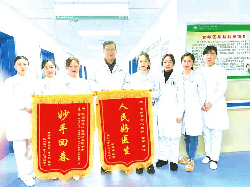 近日,市中心医院老年医学科意外收到一个圆柱形快递,拆开后发现竟是两面鲜红的锦旗。这两面锦旗是康复患者林老托儿子寄来的,传递的不仅是患者的感激之情,更是对医护人员工作的充分肯定。(随州日报通讯员董健 邱紫菡摄)