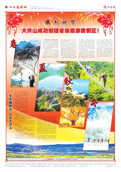 随州日报讯(特约记者贺晓利)近日,省文化和旅游厅公布新一批省级旅游度假区名单,大洪山旅游度假区榜上有名。这是大洪山风景名胜区在2021年12月成功创建省级全域旅游示范区的基础上获得的又一殊荣,也是在创建国家级旅游度假区的征程上迈出的重要一步。