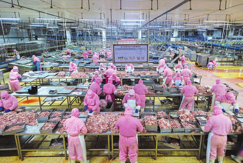 2月5日,湖北正大有限公司鸡肉加工车间工人正在自动化流水线上忙个不停,大家铆足干劲,以最饱满的精神冲刺首季“开门红”。该公司从2月4日正式开工,每天屠宰近10万只鸡,主要供应中南地区麦当劳和肯德基。预计全年生产加工肉鸡5000万只。 (随州日报全媒记者李文军、特约记者钟克波摄)
