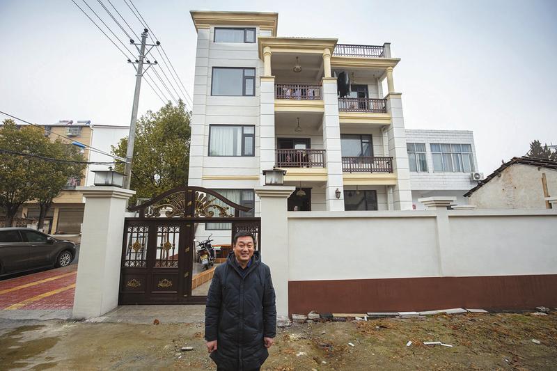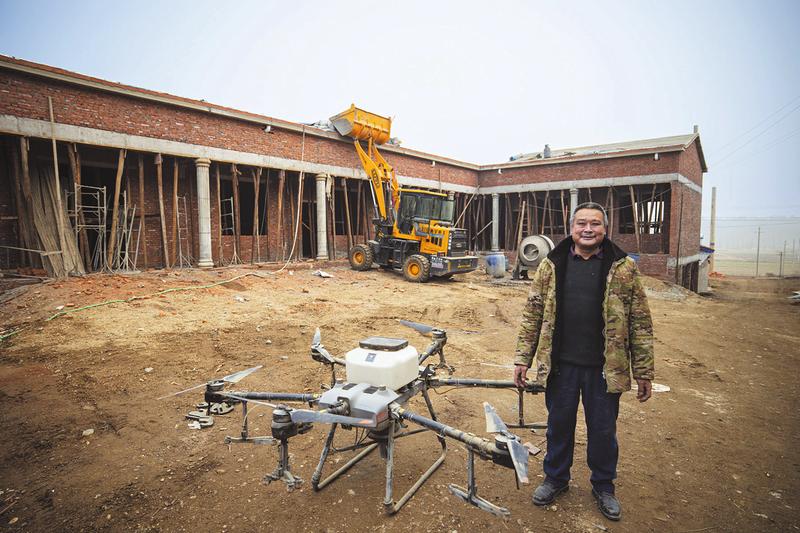 ⑤随县澴潭镇黄林村种粮大户黄立勇耕种了2000余亩农田。图为他2021年花6万元购买的植保无人机,他身后是自家正在建设中的520平方米的新住房。