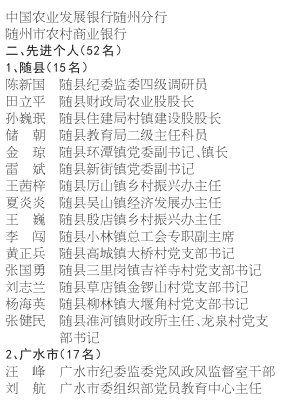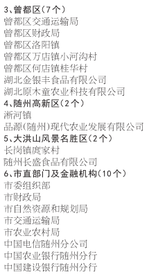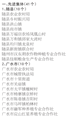一、先进集体(41个)1、随县(10个)随县农业农村局随县乡村振兴局随县洪山镇随县尚市镇随县万福店农场凤凰山村随县万和镇邱家大湾村随县均川镇龙泉村随县新街镇联合村随州市汉东玥农作物种植专业合作社随县佳刚粮食生产专业合作社2、广水市(10个)广水市农业农村局广水市城管执法局广水市十里街道广水市关庙镇广水市太平镇檀树村广水市杨寨镇京桥村广水市陈巷镇吉阳村广水市马坪镇柏林村广水市融军种养殖专业合作社广水市应山红星养殖专业合作社3、曾都区(7个)曾都区交通运输局曾都区财政局曾都区洛阳镇曾都区万店镇小河沟村曾都区何店镇桂华村湖北金银丰食品有限公司湖北原木童农业科技有限公司4、随州高新区(2个)淅河镇品源(随州)现代农业发展有限公司5、大洪山风景名胜区(2个)长岗镇庹家村随州长盛食品有限公司6、市直部门及金融机构(10个)市委组织部市财政局市自然资源和规划局市交通运输局市农业农村局中国电信随州分公司中国农业银行随州分行中国建设银行随州分行中国农业发展银行随州分行随州市农村商业银行二、先进个人(52名)1、随县(15名)陈新国随县纪委监委四级调研员田立平随县财政局农业股股长孙巍珉随县住建局村镇建设股股长储朝随县教育局二级主任科员金琼随县环潭镇党委副书记、镇长雷斌随县新街镇党委副书记王茜梓随县厉山镇乡村振兴办主任夏炎炎随县吴山镇经济发展办主任王巍随县殷店镇乡村振兴办主任李闯随县小林镇总工会专职副主席黄正兵随县高城镇大桥村党支部书记张国勇随县三里岗镇吉祥寺村党支部书记刘志兰随县草店镇金锣山村党支部书记杨海英随县柳林镇大堰角村党支部书记张健民随县淮河镇财政所主任、龙泉村党支