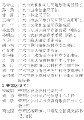 部书记2、广水市(17名)汪峰广水市纪委监委党风政风监督室干部刘航广水市委组织部党员教育中心主任吴青松广水市水利和湖泊局规划财务股股长孙黎广水市卫生健康局干部甘露广水市林业局干部王艳华广水市生态环境分局环保研究所所长肖华广水市文化和旅游局党组成员孙章勇广水市交通运输局党组成员、副局长孙明杰广水市武胜关镇党委委员、副镇长李兵申广水市骆店镇党委副书记胡小东广水市蔡河镇杨坡村党支部书记严春才广水市吴店镇党委书记黄艳峰广水市广水街道驼子村党支部书记余勇广水市李店镇农技推广中心主任李玲广水市长岭镇云台村村委会副主任刘红广水市应山街道黑虎冲村党支部书记秦绍栋广水市农业农村局农村社会事业管理