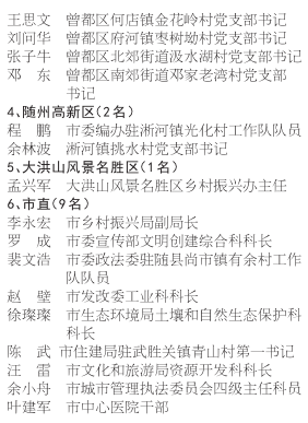 书记4、随州高新区(2名)程鹏市委编办驻淅河镇光化村工作队队员余林波淅河镇挑水村党支部书记5、大洪山风景名胜区(1名)孟兴军大洪山风景名胜区乡村振兴办主任6、市直(9名)李永宏市乡村振兴局副局长罗成市委宣传部文明创建综合科科长裴文浩市委政法委驻随县尚市镇有余村工作