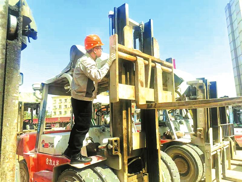 湖北特检院随州分院不断夯实“我为群众办实事”活动成果,弘扬“四特”精神,助力企业实现“开门红”。近日,该院高效完成了随县吴山镇金利石材厂在用叉车的检验工作,图为检验人员正在进行叉车起升链条、轨道检验。 (随州日报通讯员 任坤 贺文珍摄)