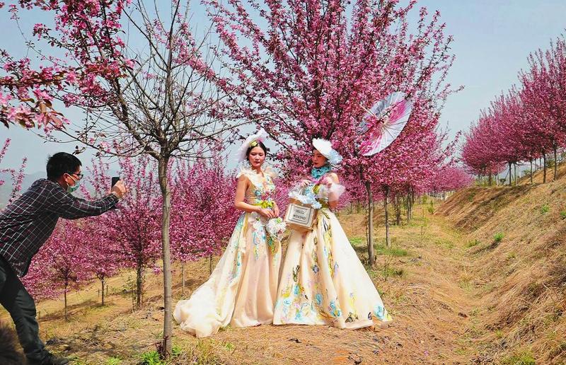 3月29日,广水市第二届海棠文化旅游节云赏花活动在吴店镇举行。2000余亩海棠园,粉红的海棠花开正艳,一团团、一簇簇聚在枝头,随风摇曳,吸引众多游客前来观赏游玩。现场还有古装秀、古筝演奏、农特产品展销等活动。(随州日报全媒记者 李文军摄)