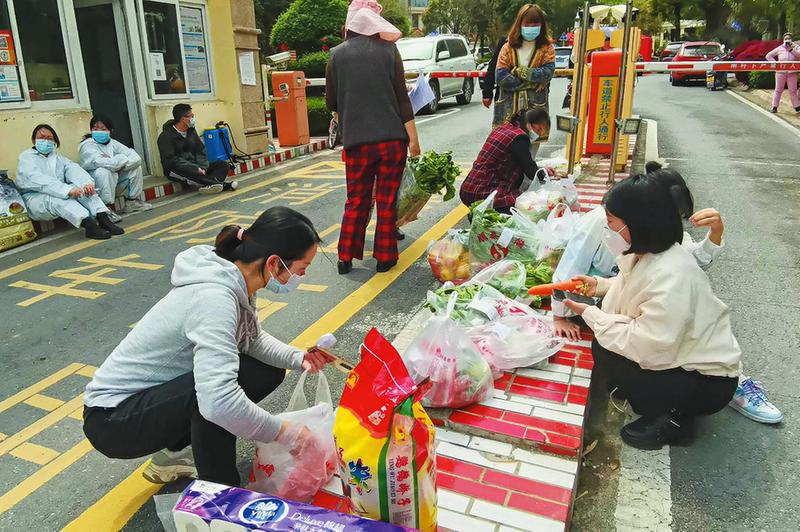4月1日,随州城区各社区协同银泰新生活超市、顺泰仓储等大型商超组织统一采购,集中向小区居民配送蔬菜、粮食等必需生活物资。 (随州日报全媒记者李文军摄)