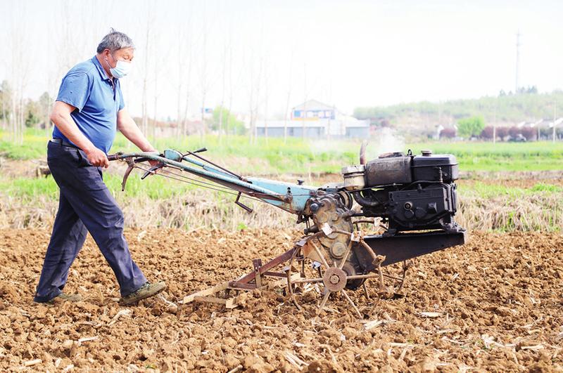 高城镇七里塔村村民何高云正在用手扶拖机为刚播种的玉米地耙平保湿。