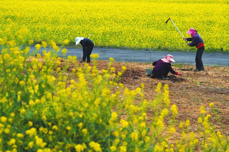 随县冬种油菜绿色高质高效生产基地油菜丰收在望。该项目比常规种植油菜节本增效5%以上,平均亩产200公斤,节本增效150元。图为农民在油菜田里套种旱作物,以进一步提高种植效率。(随州日报全媒记者孙洪涛摄)