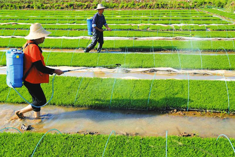 随县炎丰高城种植农民专业合作社采用“工厂化育秧+商品化供秧+保姆式市场化服务”农业生产新模式,确保农民种稻更省时、省力、省钱,助力乡村振兴。图为4月27日,该合作社为农户进行育秧服务。