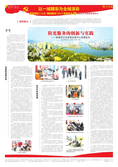 2月17日,市委常委会召开会议强调:“要突出迎接学习宣传贯彻党的二十大这根主线,用心用力组织新闻宣传、社会宣传,巩固拓展党史学习教育成果,持续壮大主流思想舆论,为实现‘全域出彩’‘再续精彩’提供坚强思想保证和强大精神力量……”为贯彻市委常委会议精神,为以实际行动迎接党的二十大胜利召开,为用激昂的文字,感人的“镜头”,动人的笔触勾画、记录、讴歌各地各部门高质量发展取得的新成果新成就,充分展示新时代各地各部门的良好精神面貌,引导和激励广大干部群众,以昂扬的姿态奋力打造“汉襄肱骨、神韵随州”营造氛围凝聚力量,随州日报重磅推出大型纪念特刊——“喜迎党的二十大·以一域精彩为全域添彩·神韵随州100个发展样本”大型专题宣传活动,今日刊登的是曾都区公共资源交易中心发展纪实,敬请读者关注。