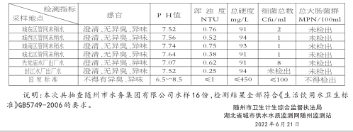 湖北省城市供水水质监测网随州监测站、随州市卫生健康综合监督执法局根据《城市供水水质管理规定》联合于2022年6月10日对随州市水务集团有限公司先觉庙水厂和封江水厂出厂水和16个管网末稍水水质进行了抽样监测,现将抽查检测结果公告如下: