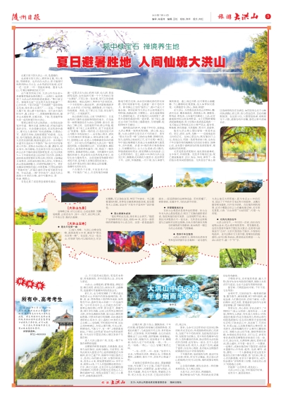 山高人为峰。大洪山主峰宝珠峰,海拔高度1055米,被誉为“楚北天空第一峰”。在这里,可以一览众山,任思绪飞扬;可以临风而立,任衣衫飘飘;可以登临金顶,梦回千年唐宋。当云翻雾涌的时候,各种仿古建筑群忽隐忽现,犹如置身天上宫阙,定会有“不知今夕是何年”美妙错觉。