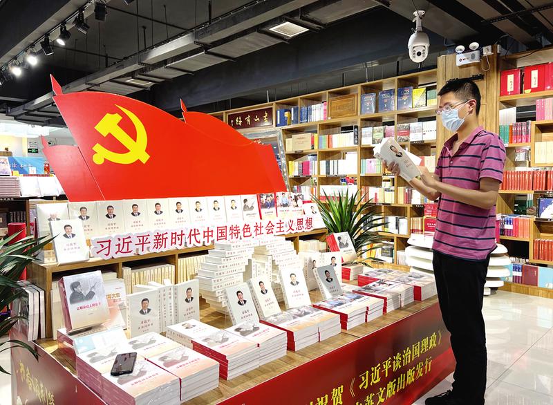 《习近平谈治国理政》第四卷中英文版上市以来,市新华书店设立专柜,重点推介宣传和展示销售,满足广大市民学习需求。图为7月19日,市民在专柜前翻阅《习近平谈治国理政》第四卷。 (随州日报全媒记者 徐斌摄)