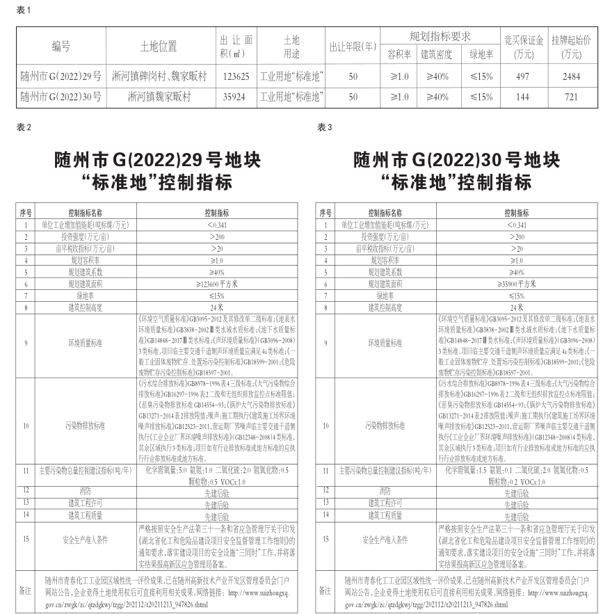 1、随州市G(2022)29号地块“标准地”控制指标(见表2)