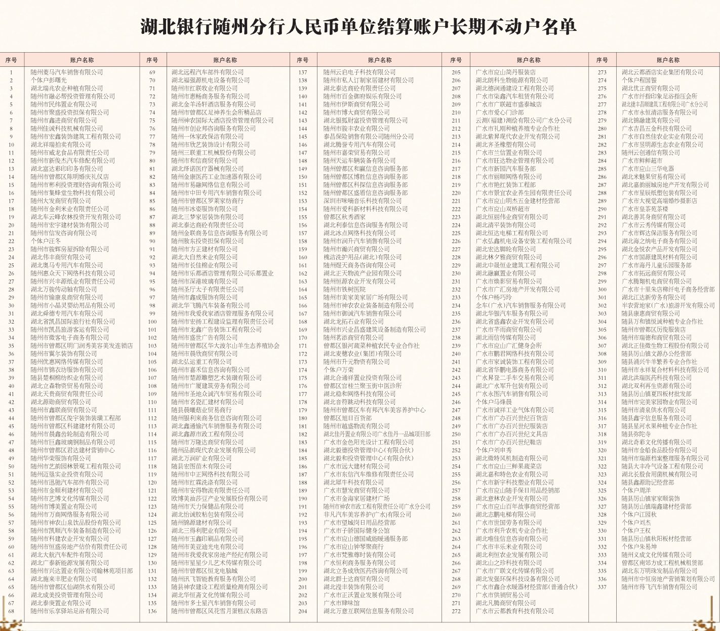 为加强银行结算账户管理,我行根据中国人民银行《人民币银行结算账户管理办法》(中国人民银行令[2003]第五号)第五十六条“银行对一年未发生收付活动且未欠开户银行债务的单位银行结算账户,应通知单位自发出通知之日起30日内办理销户手续,逾期视同自愿销户,未划转款项列入久悬未取专户管理”规定,现对以下符合条件的账户进行公示。请名单内客户自本公告发出之日起30日内携带相关资料到开户网点办理销户手续,逾期将视同自愿销户。销户后原账号将进行注销处理,且不能恢复使用。
