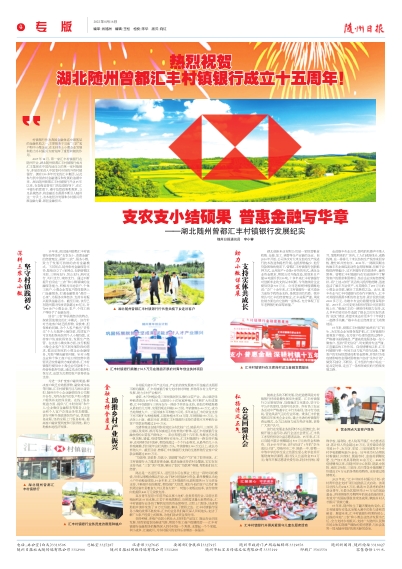 15年来,随州发生了翻天覆地的变化,汇丰村镇银行亦是这发展大潮中的参与者和贡献者。展望未来,汇丰村镇银行将秉持初心,以推动本地“三农”和小微企业经济发展为己任,全力支持乡村振兴,支持广大随州人民和市场主体实现增产增收的美好愿景,与社会各界一同为随州更好的明天踔厉奋发。