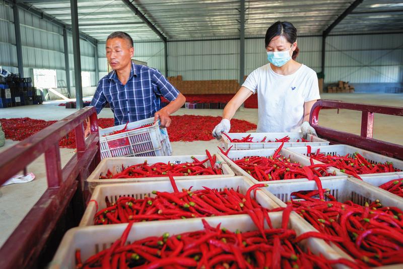 随县高城镇农民今年种植的1000亩红线椒喜获丰收。据村民介绍,他们今年种植的红线椒每亩可收入1万多元,明年将扩大种植面积,增加收入。 (随州日报通讯员 张玉国摄)