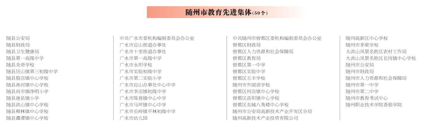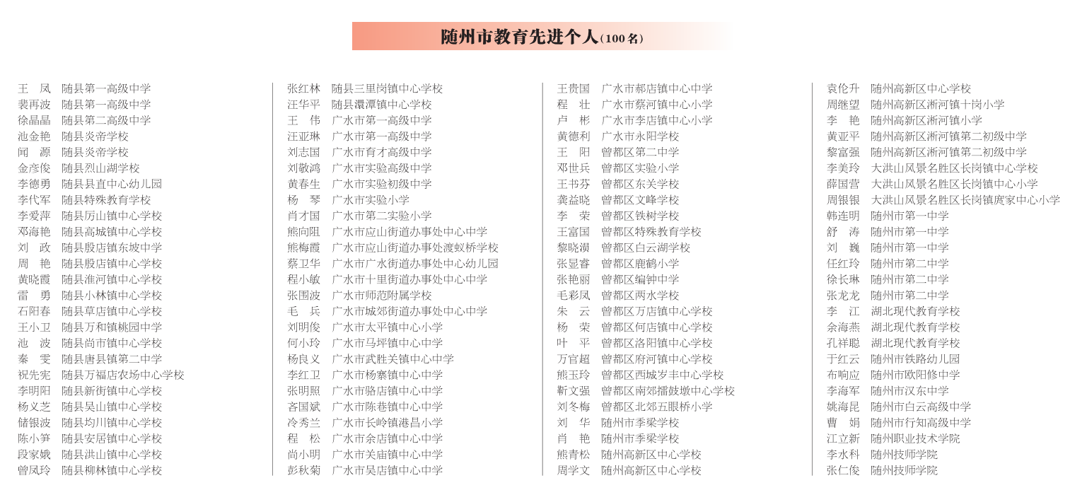 为大力弘扬尊师重教光荣传统,强化榜样引领感召作用,让身边人讲好身边事、用身边事激励身边人,在第38个教师节来临之际,经各地评选推荐、组织考核和网上公示等程序,中共随州市委、随州市人民政府决定对随县公安局等50个“随州市教育先进集体”,王凤等100名“随州市教育先进个人”予以表彰,进而激发社会各界关心和支持教育发展,激励广大教师和教育工作者坚定理想信念、厚植爱国情怀、涵养高尚师德、争做“四有”好老师、当好“四个引路人”,积极探索新时代教育教学方法,不断提升教书育人本领,努力培养担当民族复兴大任的时代新人,为推动随州教育高质量发展作出新的更大的贡献!